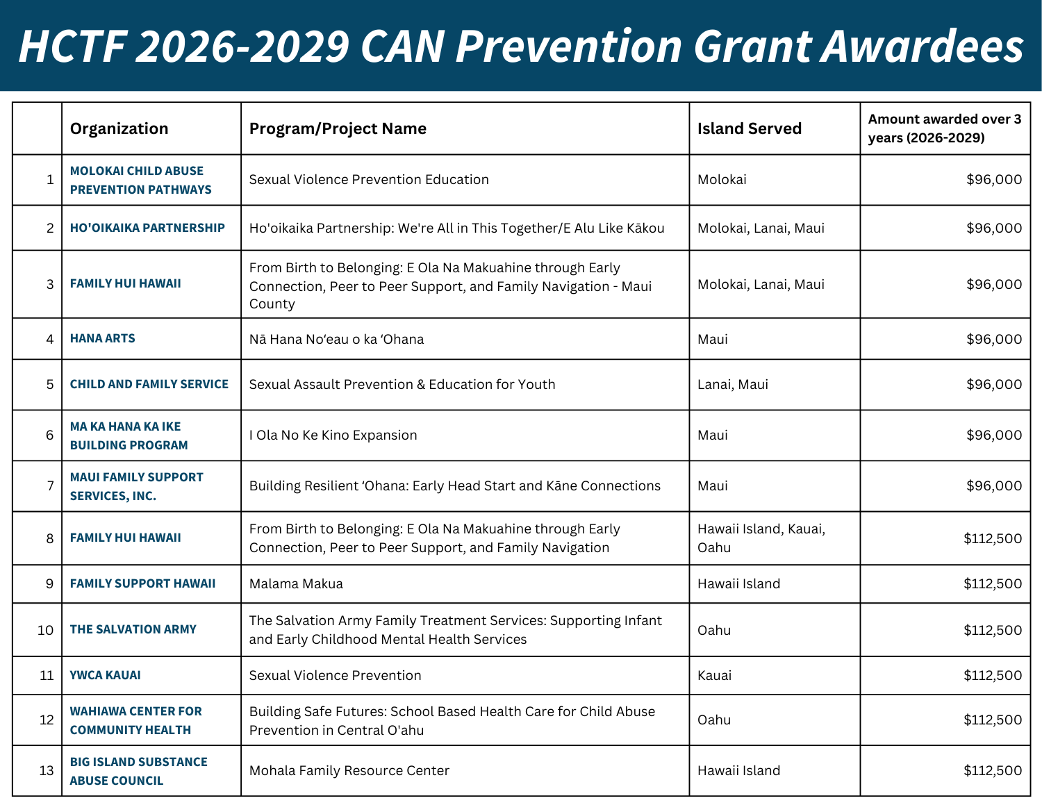 The purpose of the Hawai‘i Children's Trust Fund is to prevent child abuse and neglect (CAN), and for the development of programs for children to increase their ability to form healthy relationships, and to avoid and cope with dangerous situations. For Primary and Secondary Prevention programs, services, or projects focused on immersive programming and impact-focused outcomes. Preference will be given to programs focused on mental health, substance abuse, and family resource programs and services. This funding opportunity is open to organizations providing services in and for Maui County, with preference for those serving fire-affected families/communities.